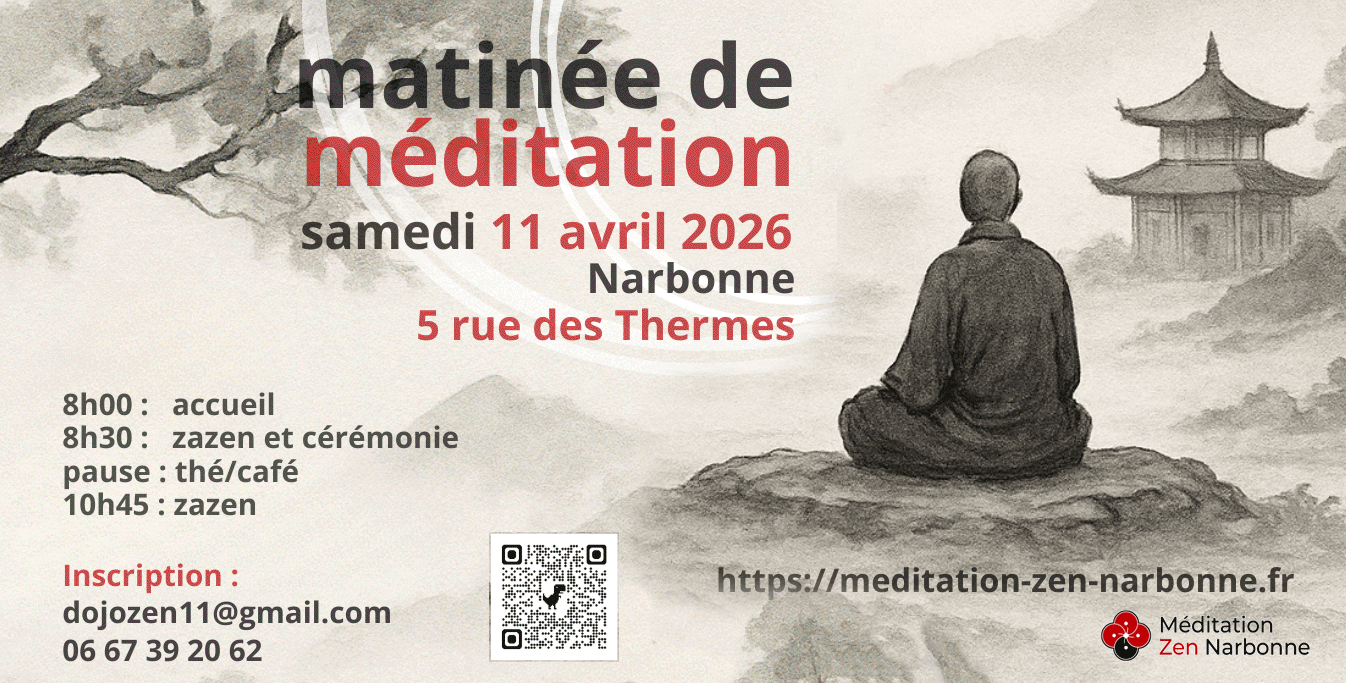 Samedi 11 avril 2026, une matinée de méditation zen, sera animée par le maître zen Pascal-Olivier Kyōsei Reynaud et les pratiquants de Méditation Zen Narbonne.
